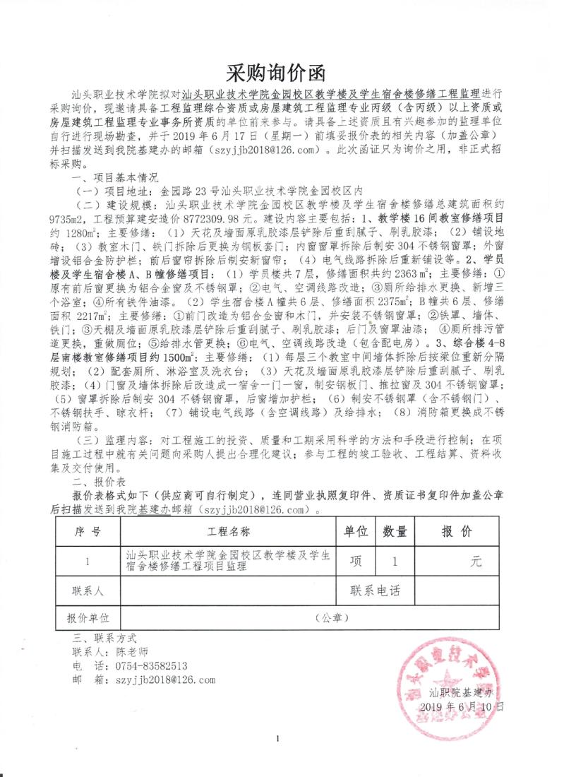 万象城体育awcsport金园校区教学楼及学生宿舍楼修缮工程监理采购询价函