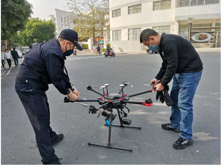 民警准备放飞警用无人机。