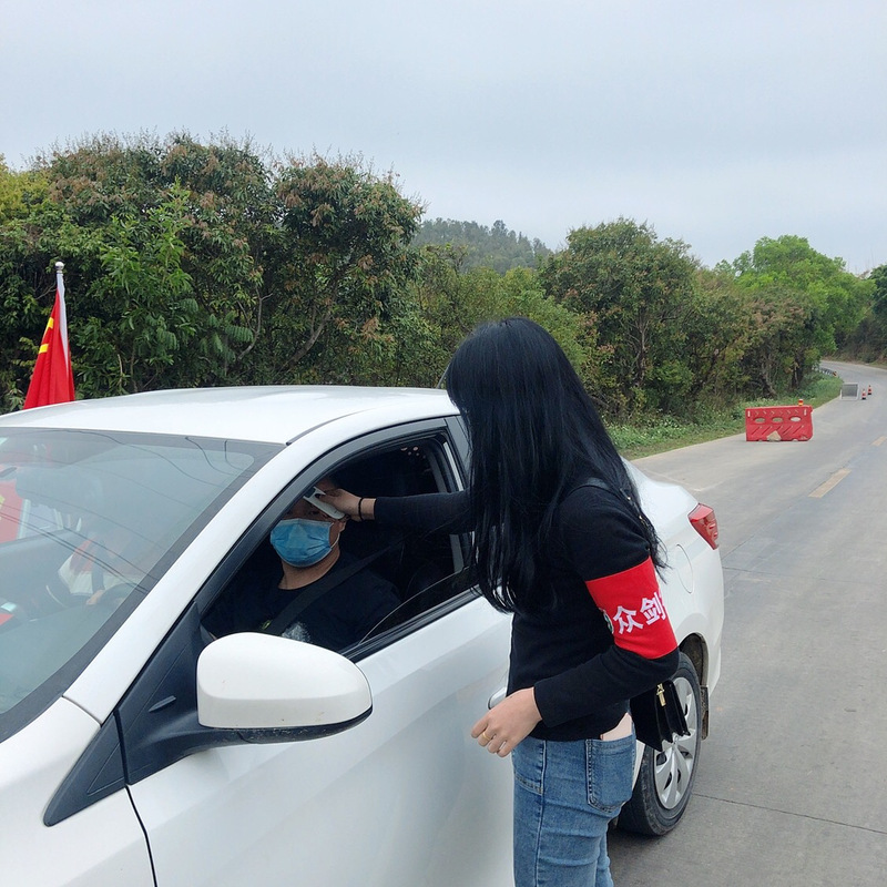 (刘晓燕在检查点协助社区测量来往人员体温)