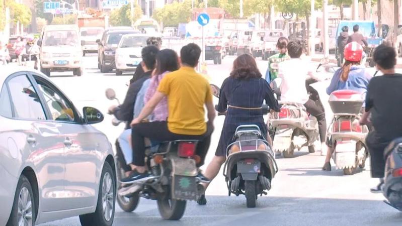 昨天上午10点多,记者在黄河庐山路口看到,这里的交通秩序较为混乱。不少摩托车、电动车、共享单车逆行进入庐山路。你看,这部无牌摩托车居然搭载了4人,而且都没戴安全头盔。