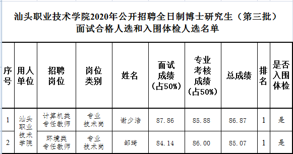 附件:汕头职业技术学院2020年公开招聘全日制博士研究生(第三批)面试合格人 选和入围体检人选名单