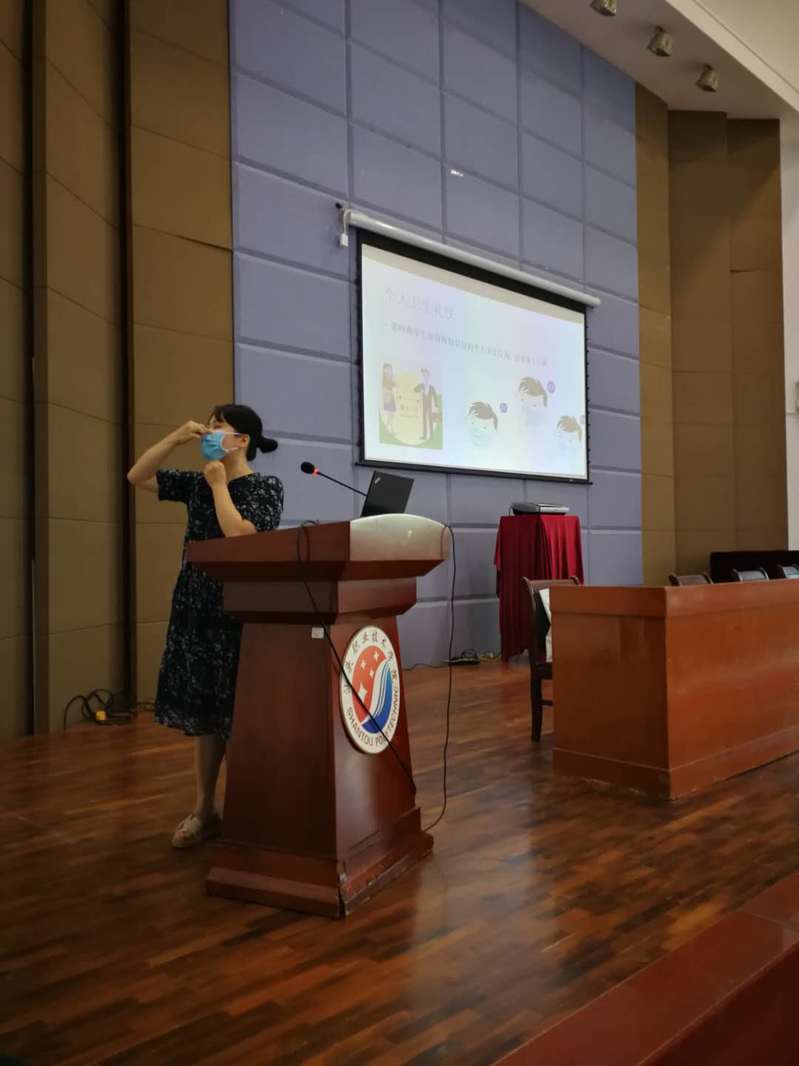 此次防疫专题培训由学院兼职驻校医护人员林韵主管护师主讲。林护师深入浅出地讲解了常态化新冠肺炎疫情防控机制下、如何做好个人防护、环境消毒和消毒液的配置等,尤其是对日常操作过程中看似习惯、却存在巨大安全隐患的细节进行了规范,对如何正确的佩戴口罩、正确进行七步洗手、正确进行体温检测等做了详细的讲解并进行了现场演示。