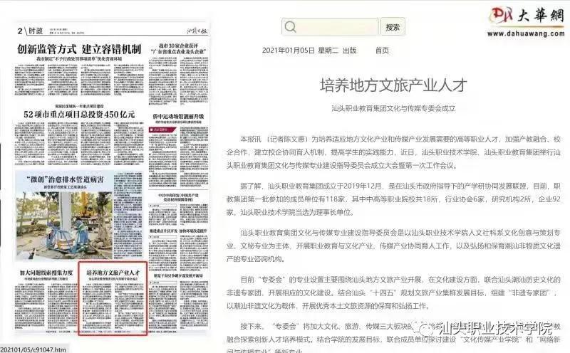1月1日,《汕头新闻》专题报道了职教集团文化与传媒专业建设指导委员会(下称“文化与传媒专委会”)成立大会,以及人文社科系近几年专业发展和校企合作的工作成果。《汕头日报》和“橄榄台”等本地主要媒体也同步采访。