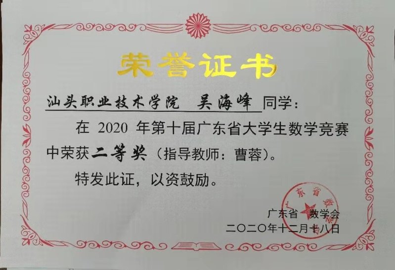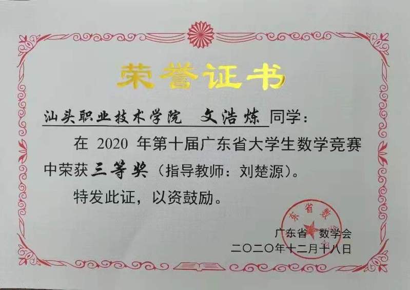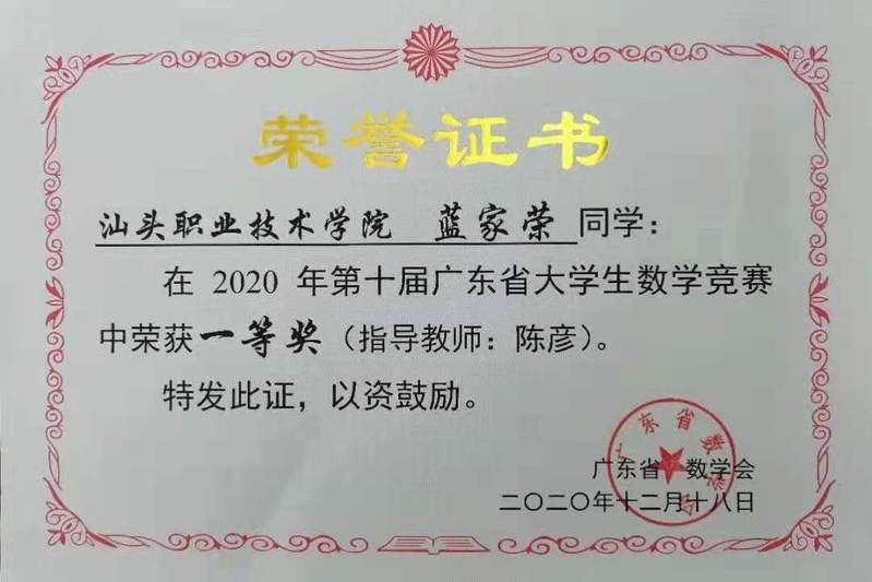 自然科学系牵头组队的学生团队在2020年11月28日举办的第十二届全国大学生数学竞赛初赛暨第十届广东省大学生数学竞赛中喜获“民办及高职高专类”佳绩,取得了8人参赛5人获奖的佳绩。其中一等奖2人,分别为2019级数学教育3班的陈军宇同学和2019数学教育1班的蓝家荣同学;二等奖2人,分别为2018数学教育1班的王梓奕同学和2018数学教育2班的吴海峰同学;2018机电一体化2班的文浩炼同学获三等奖。