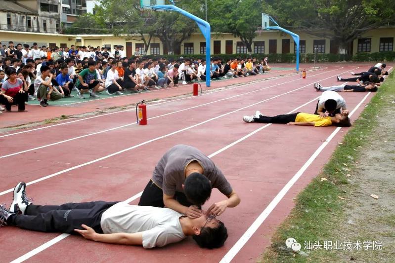 撤离至操场后,学院退伍复学的张琦同学还演示了灭火器使用方法,讲述了使用灭火器时的注意事项;自救互救小队进行心肺复苏演练,让同学们学习如何正确运用心肺复苏方法。