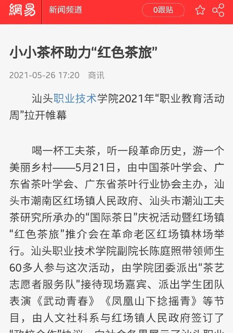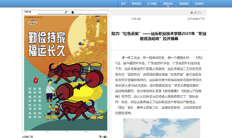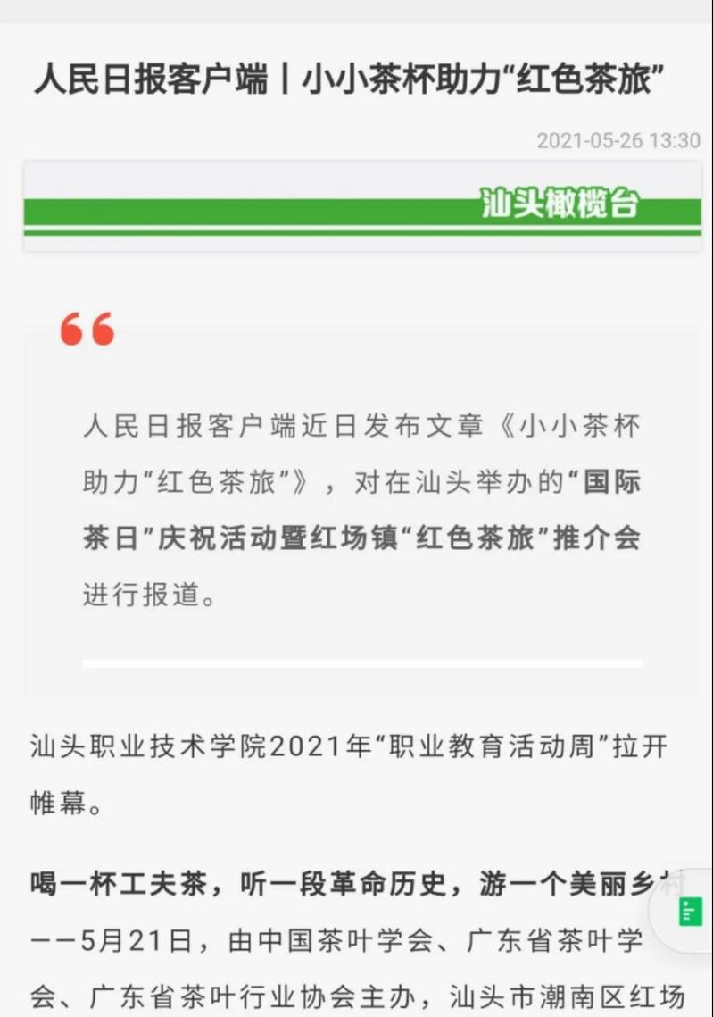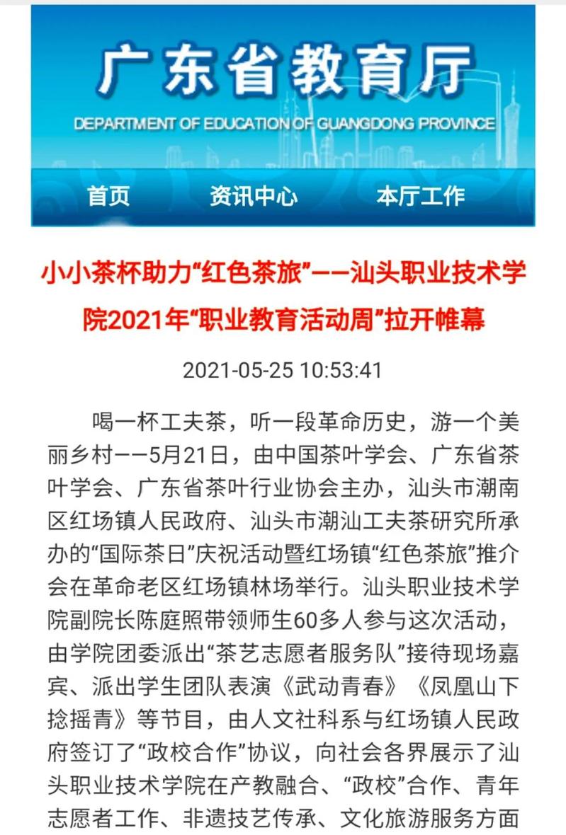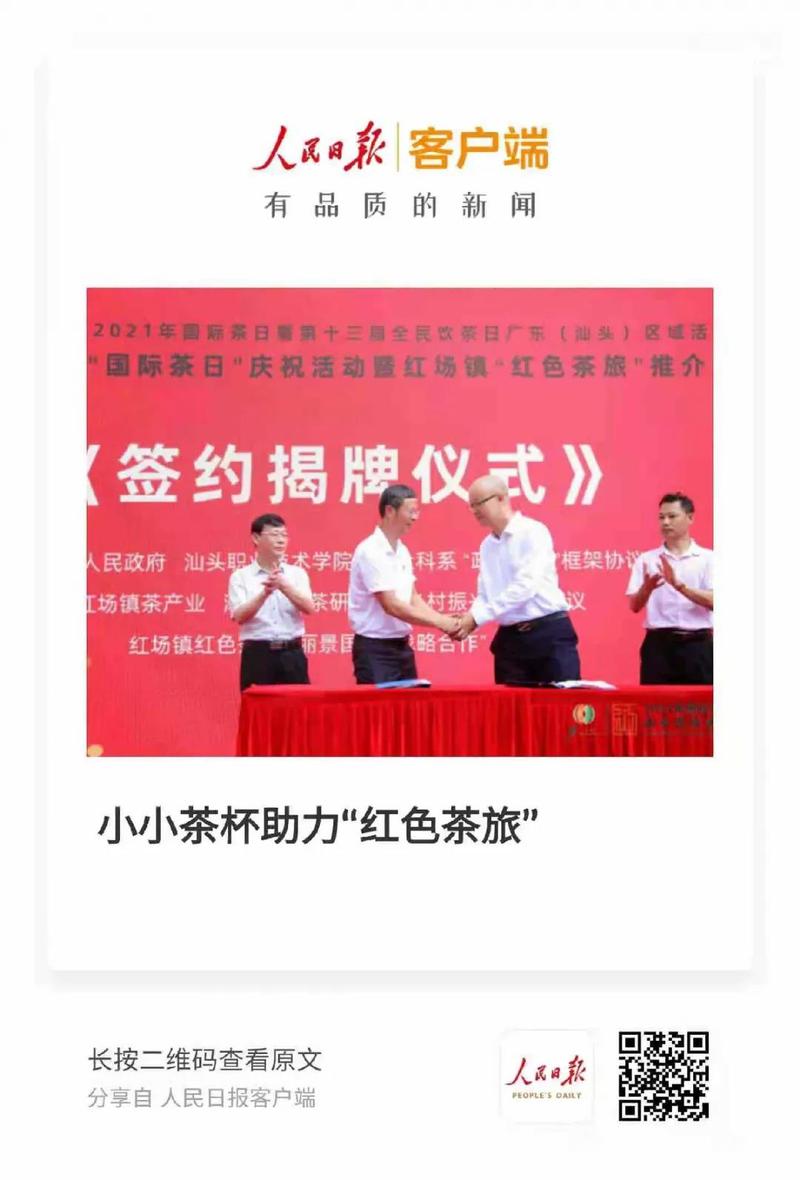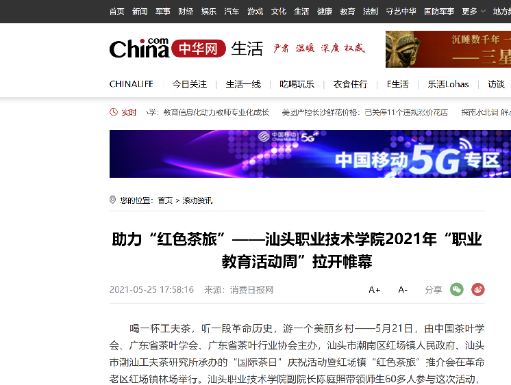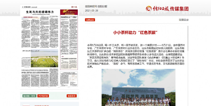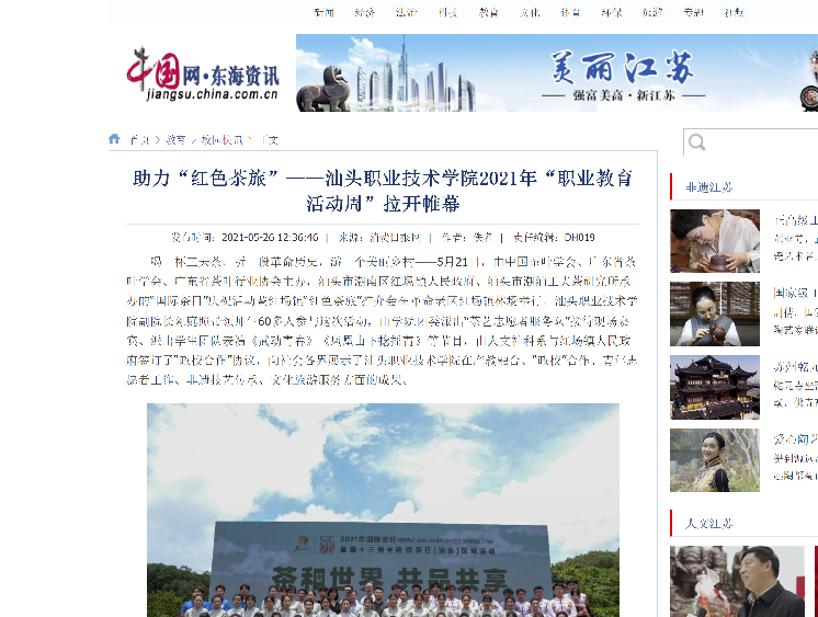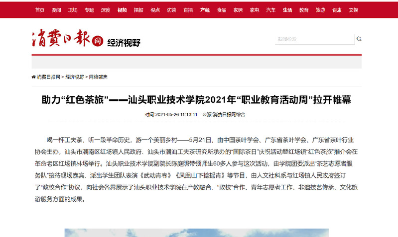 该活动经人民日报客户端以《小小茶杯助力“红色茶旅”》为名予以报道后,浏览量达到7.3万,多家中央媒体、省市媒体和门户网站——广东省教育厅、《消费日报》《海峡都市报》《信阳日报》《菏泽日报》、中国网、中华网、新浪、网易、搜狐、橄榄台纷纷转载,汕头电视台《今日视线》栏目也进行现场报道,宣传了学院在职业教育领域的办学成绩,提升了学院办学美誉度。