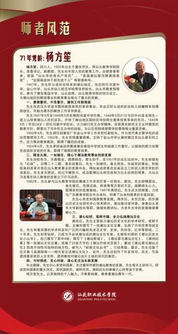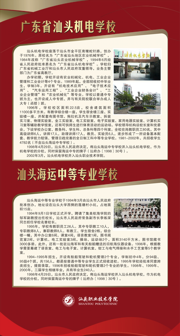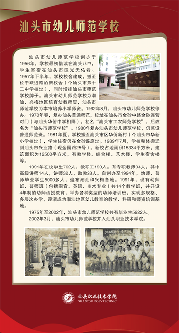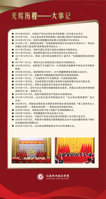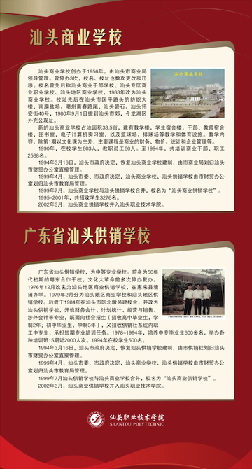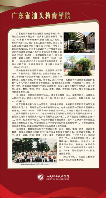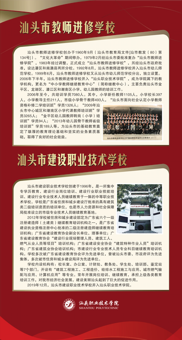 为庆祝建党百年华诞,响应党史学习教育,学习办校以来,在党的领导下,学院老党员、老干部、教职员工立德树人的精神,培养汕职师生的爱校爱国情怀,学院在院本部图书信息大楼一楼展厅举办了“为党育人  为国育才”主题校史展。