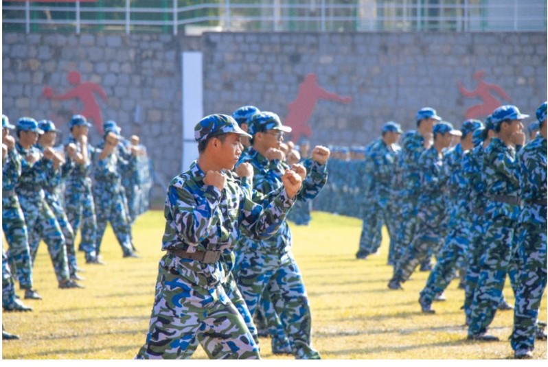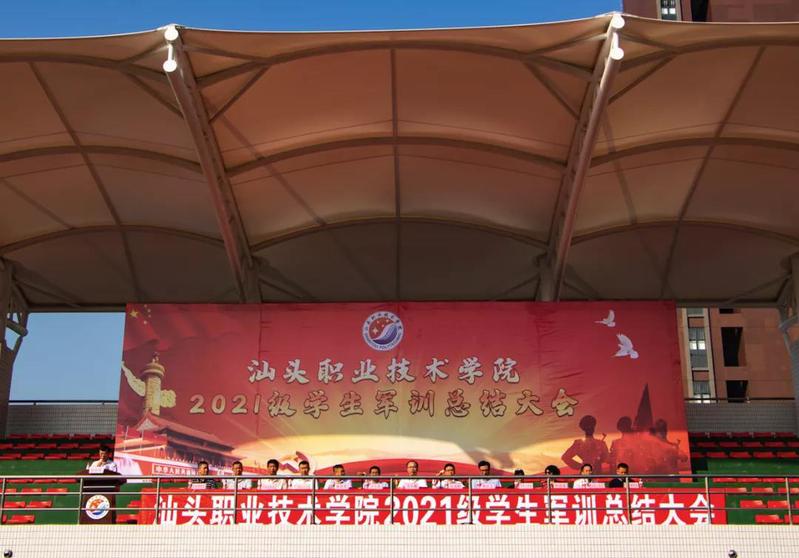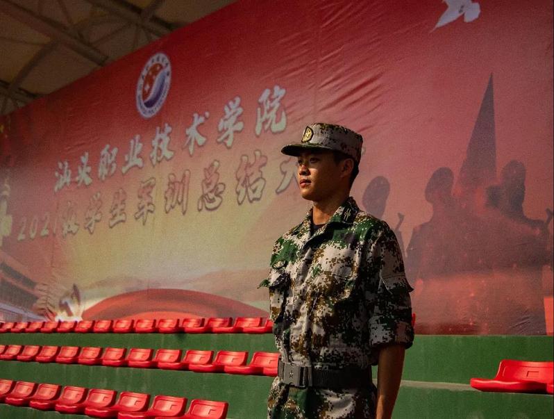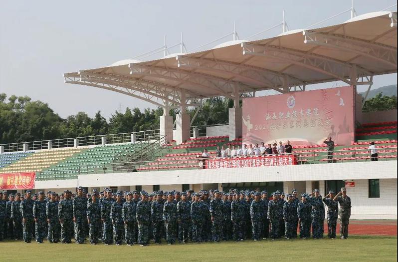 军训总结大会在庄严的国歌声中拉开序幕。会议由学院副院长陈庭照同志主持。在承训单位濠江区武装部副部长吴成财海军中校的陪同下,我院党委书记王小辉同志作出指示:“按计划进行。”