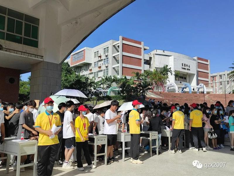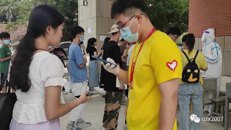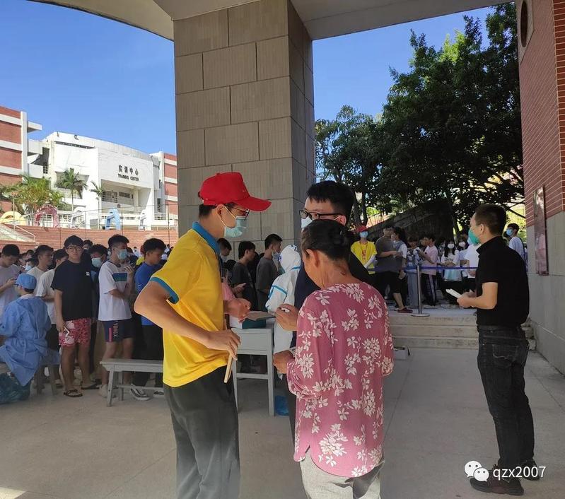 在“小黄人”的组织沟通下,检测人员有序排起了队伍,每一组队伍前列,均有“小黄人”引导,扫码登记出现问题时及时解决,队伍轮候有空缺时及时快速补上,在等候区、核对区、登记区、检查区,整个检测过程人流流动迅速有序。