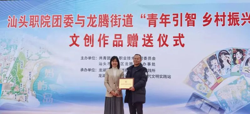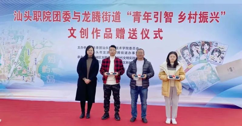 12月26日上午,由学院团委与龙湖区龙腾街道办事处联合主办、龙腾街道新时代文明实践所及妈屿社区新时代文明实践站共同承办的“青年引智 乡村振兴”文创作品赠送仪式在龙腾街道妈屿社区文化广场顺利举办。学院团委陈锦莹书记,龙腾街道党工委刘锐沛书记,副书记、办事处王浩主任等领导参加仪式。