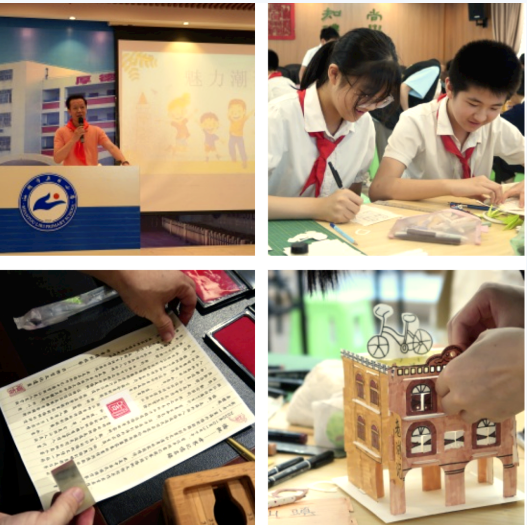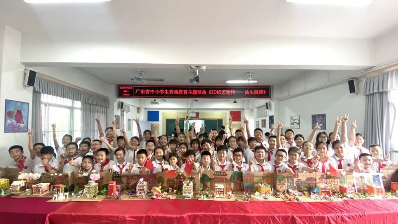 本次课程内容由人文社科系文化创意与策划专业师生与广东省技术能手、省市各级非遗传承人、文创设计师联合设计。在丹霞小学,文化创意与策划专业师生通过创意设计、3D建模、材料选择、手工组装等工序,与小学生们协作完成《3D纸艺建构——汕头骑楼》系列作品,用实物作品展现汕头开埠历史文化区的魅力。此外,该课程还有《编织工艺》《潮语劳动歌谣》《侨批如意章镌刻技艺》《潮绣技艺》《潮汕工夫茶冲泡技艺》等单元,既体现了技术创新与技能应用的理念,也蕴含了汕头作为著名侨乡、百载商埠的文化内涵。