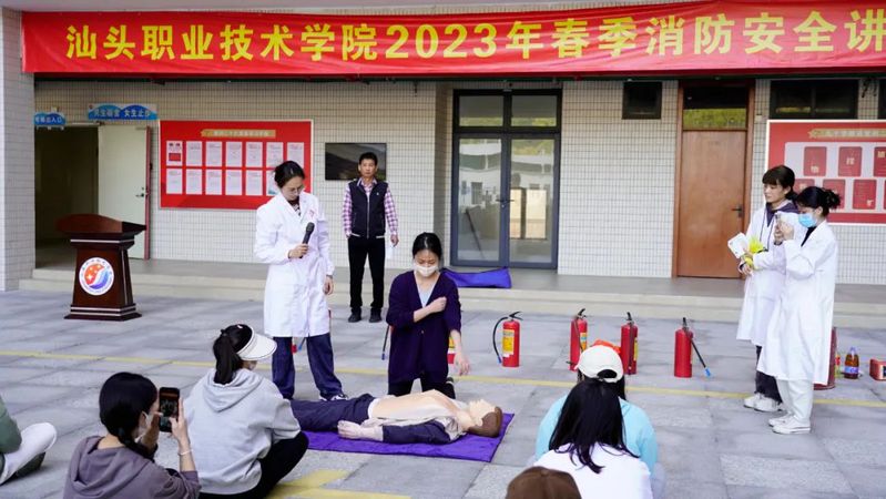 首先,活动组织学生进行应急疏散演练。现场学生听从指挥,按照指定路线,迅速有序地进行紧急疏散。其次进行急救知识培训。学院医务所所长谢薇为大家讲解急救知识并进行现场演示和指导。最后开展消防安全讲座。濠江区消防站指导员刘培涛、张开鑫和罗少忠讲解了灭火器、消防水带以及防毒面具的操作使用方法,现场演示了煤气泄漏的灭火方法。