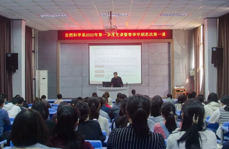 3月17日,自然科学系党总支书记张文腾以《加快建设教育强国、科技强国、人才强国》为主题,在金园校区阶梯教室为全体教职工和学生代表共90人开讲2023年春季学期“思政第一课”。