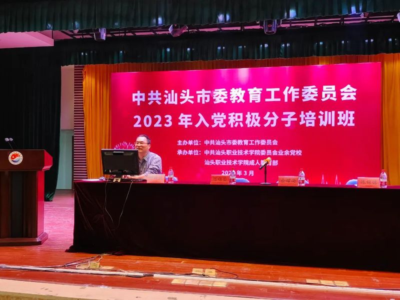 3月24日,中共汕头市委教育工作委员会2023年第一期入党积极分子培训班在我院金园校区大礼堂开班汕头市教育局机关党委专职副书记余耀海学院党委办公室主任陈锦莹成人教育部主任陈锦德出席开班仪式并分别动员讲话。