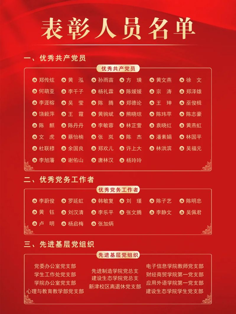 先进制造学院教工党支部荣获汕头市“先进基层党组织”;先进制造学院党总支党建品牌‘“四心”育人,筑大国工匠梦’荣获汕头市教育系统“基层党建特色品牌”;党委办公室党支部等11个基层党组织荣获学校“先进基层党组织”称号;郑传炫等46名党员荣获学校“优秀共产党员”称号;李蔚俊等15名党务工作者荣获学校“优秀党务工作者”称号。