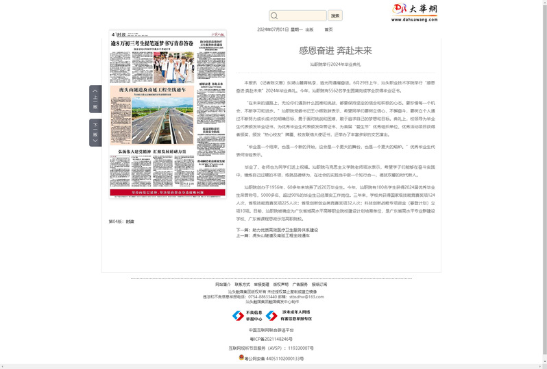 汕职院创办于1956年,60多年来培养了近20万毕业生。今年,汕职院有100名学生获得2024届优秀毕业生荣誉称号,5000多名、超过90%的毕业生已经落实工作岗位。三年来,学校共获得国家级技能竞赛奖项124人次,省级技能竞赛奖项225人次;省级创新创业类竞赛奖项32人次;科技创新战略专项资金(攀登计划)立项10项。目前,汕职院被确定为广东省域高水平高等职业院校建设计划培育单位,是广东省高水平专业群建设学校、广东省课程思政示范高职院校。