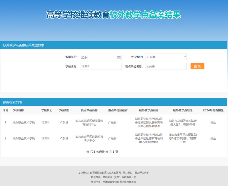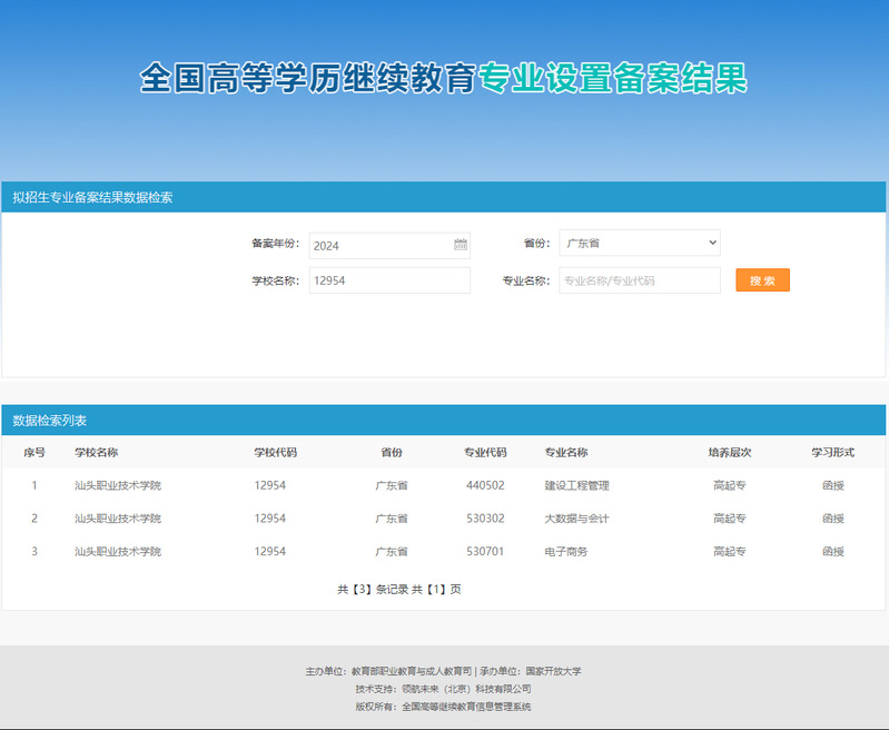 《教育部关于公布2024年高等学历继续教育拟招生专业备案结果和校外教学点设置备案结果的通知》(教职成函〔2024〕 3号,附件,以下简称《通知》)已在教育部官方网站公布,根据《通知》精神,万象城2024年高等学历继续教育拟招生专业备案3个,分别为:建设工程管理(专业代码:440502)、大数据与会计(专业代码:530302)、电子商务(专业代码:530701);万象城2024年高等学历继续教育校外教学点设置备案有2个,分别为:汕头市龙湖区新发展教育培训中心、汕头市金平区达德教育培训中心。