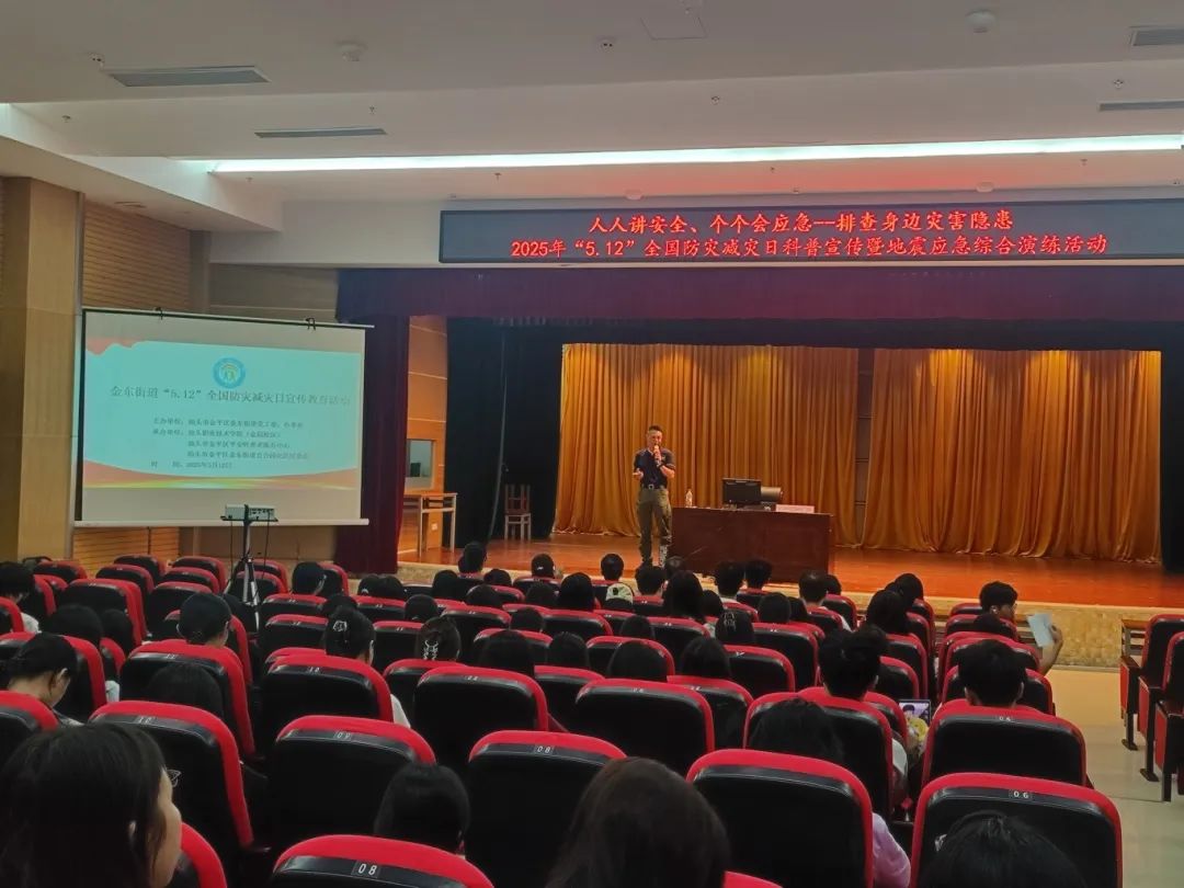 5月12日,学校校区管理办公室联合汕头市金平区金东街道党工委、办事处,百合社区居委会,平安铃养老服务中心,在金园校区举办“人人讲安全、个个会应急——排查身边灾害隐患2025年‘5.12’全国防灾减灾日科普宣传暨地震应急综合演练活动”活动。汕头市金平区平安铃养老服务中心救援队队长郑岸受邀授课,校区、街道社区相关负责人,以及志愿者、师生代表共同参与。