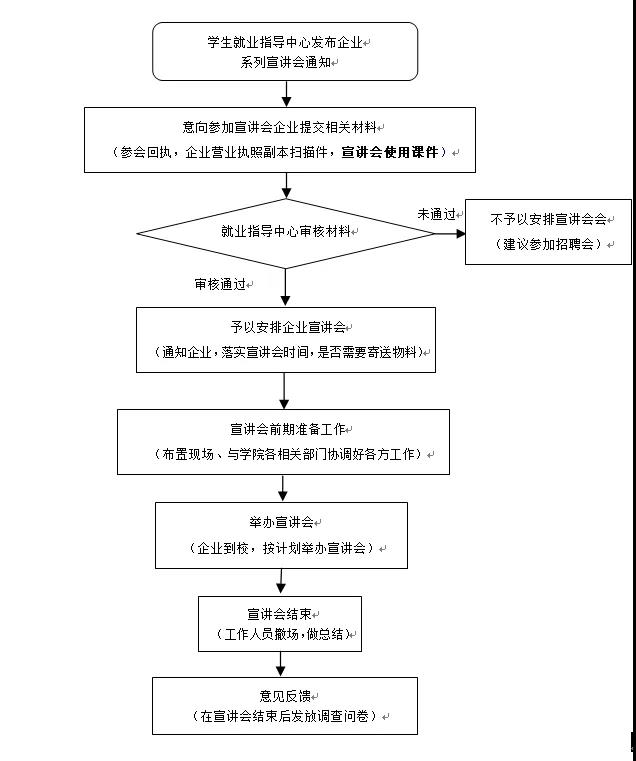 三、学生就业指导中心将根据企业提交材料,结合企业专场系列宣讲会参会企业类型、企业实际情况、企业招募职位与学院相关专业切合程度,对申请参加宣讲会企业进行审核:对审核通过的企业予以安排宣讲并告知对应企业具体时间;对审核未通过企业,根据实际情况进行推荐参加招聘会或不参加招聘会安排(详细宣讲会流程参见上图)。