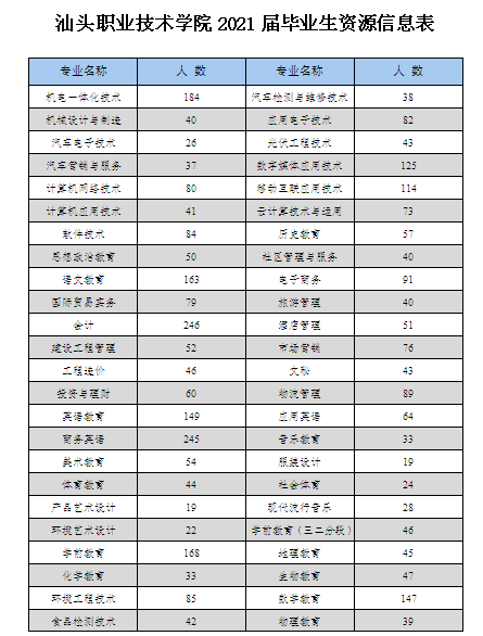 2021年,我院八个学系48个专业共有大专毕业生3582人。希望我院毕业生能为贵单位事业的发展作出积极的贡献。