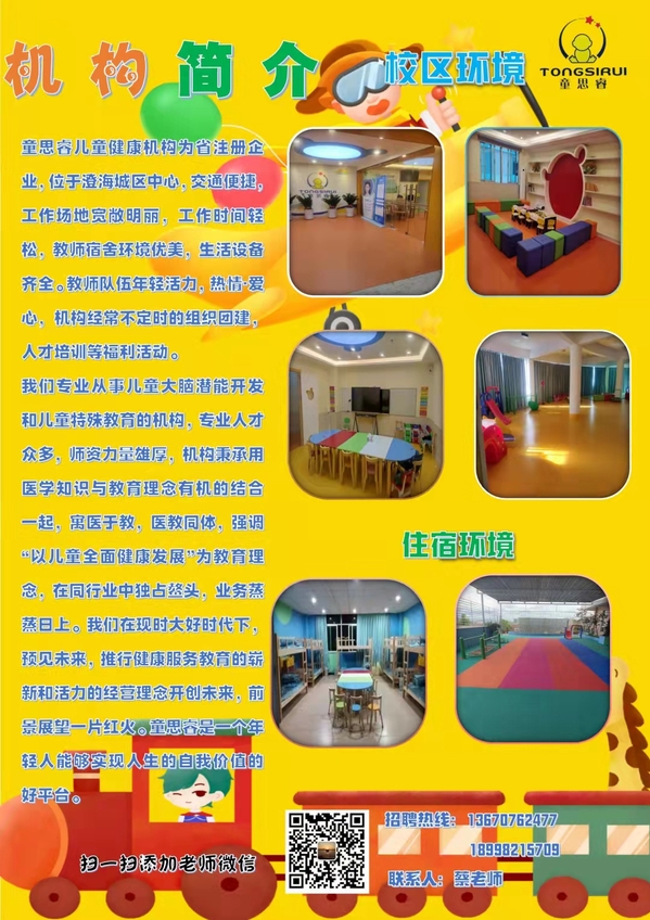 童思睿儿童健康机构为省注册企业,位于澄海城区中心,交通便捷,工作场地宽敞明丽,工作时间轻松,教师宿舍环境优美,生活设备齐全。教师队伍年轻活力,热情-爱心,机构经常不定时的组织团建,人才培训等福利活动。