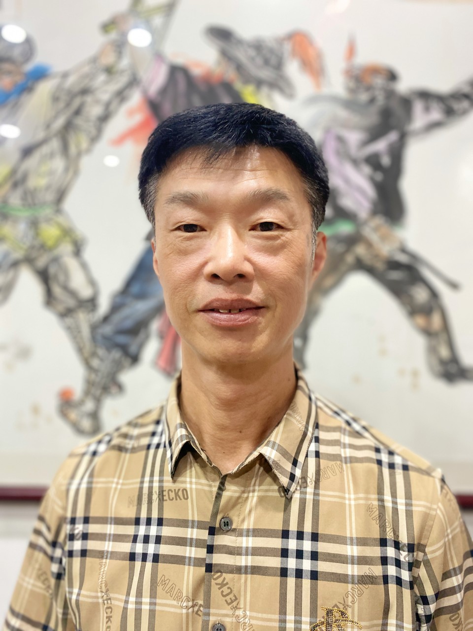 6.林芳武,男,19729月出生,潮阳棉北后溪人。国家级非物质文化遗产名录潮阳英歌项目市级传承人,现后溪英歌队队长。自幼在父亲林忠诚(林松)的耳濡目染下,对英歌产生浓厚兴趣。少年时追随母舅吴希顺(国家一级社会体育武术指导员)练习武术,13岁随父亲和杨卫老前辈练习英歌,在老前辈亲自教导下逐步成长,一路摸索发展。在保持前辈老七槌中板打法的基础上,融进武术、对打等套路、阵势,创作了十四、二十一、二十八、单打、双打、三打、三十五槌对打套路及阵型变换,被认可为潮阳英歌中快板英歌突出代表之一。设计脸谱,先后创作出108张梁山人物脸谱,以古傩文化为基础,竭力推动英歌舞脸谱的发展。