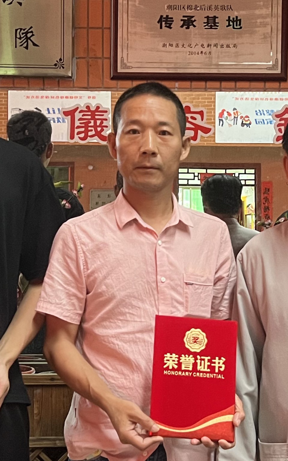 3.陈宋琪,男,19685月出生,潮阳铜盂溪西人,国家级非物质文化遗产名录潮阳英歌项目省级传承人。1992年参加溪西英歌队,凭着自己的勤奋努力,积累了丰富的经验,后任溪西英歌队教练,在原有基础上,研究创新英歌技世,取得一定成效。多年来,先后应邀到中山南头中学、和平草潮乡、峡山石尾岐乡、铜盂新桥乡、铜盂仙住乡、谷饶上堡乡、谷饶大坑乡等地当英歌教练。